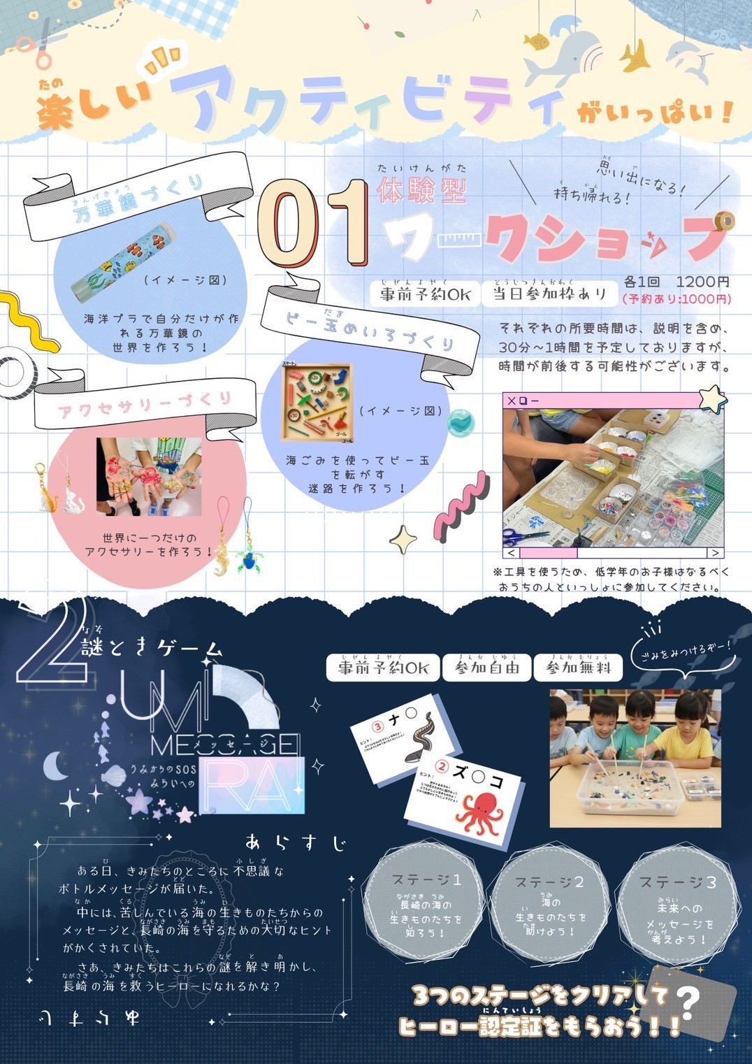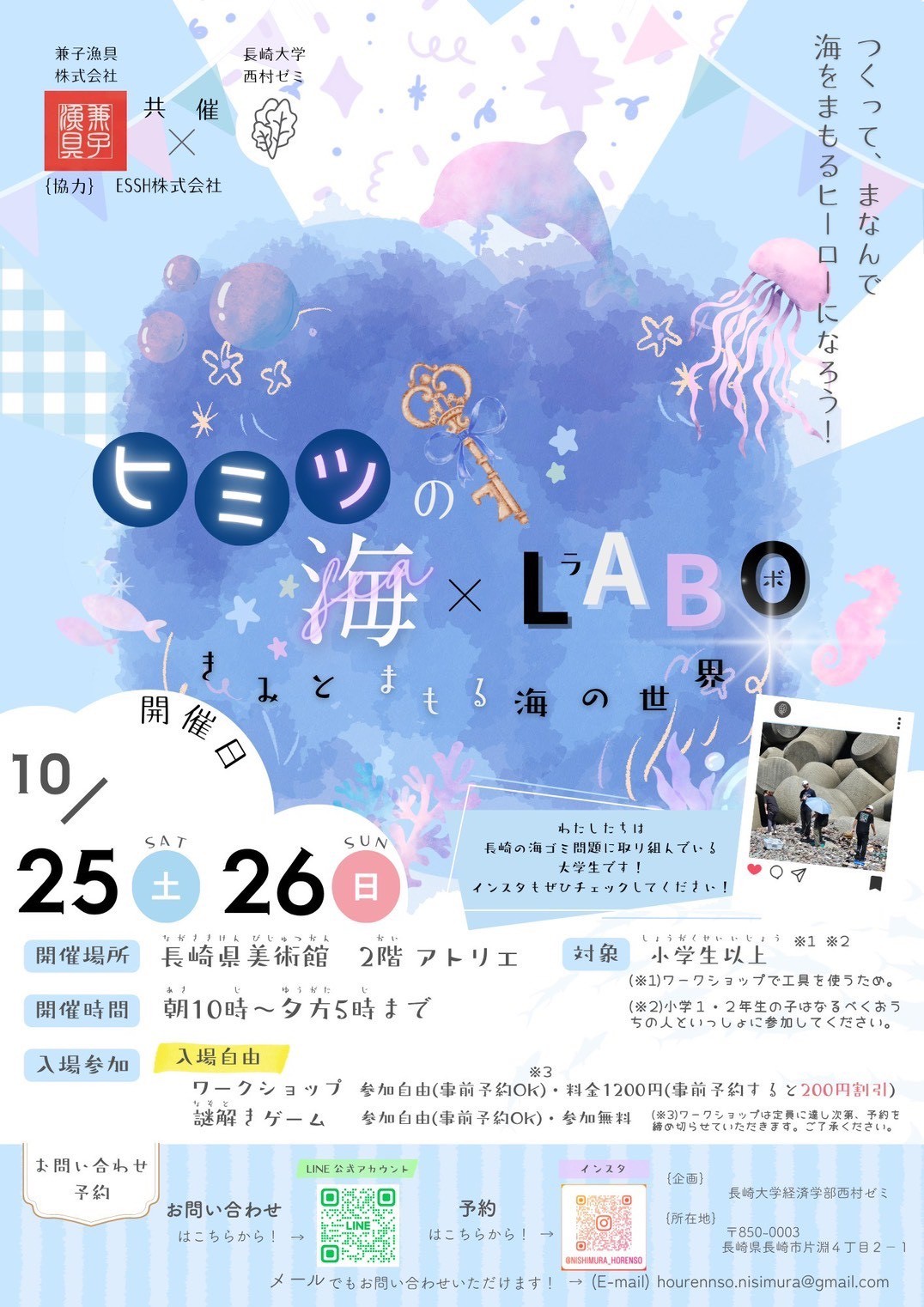 ヒミツの海×LABO (in長崎県美術館) 開催日時 2025年10月25日(土)(09:00~18:00)2025年10月26日(日)(09:00~18:00)申込時に希望日をお知らせください。 場所・アクセス 【開催場所】長崎県美術館アトリエ 【集合場所】長崎県美術館正面玄関 【アクセス】https://www.nagasaki-museum.jp/visitor/access 内容 《概要》 長崎大学経済学部・西村研究室と協働し、長崎の海洋ゴミをテーマにした体験型ワークショップイベントを開催いたします。 親子を対象に、楽しみながら長崎の海について学んでいただくことを目的としており、海洋ゴミを活用したワークショップ体験もご用意しています。 《活動内容》ワークショップの運営補助(受付対応や体験ブースでのフォローなど)をお願いしたいと考えています。 ボランティアで学べること 本イベントでは、学生が地域課題を自分ごととして捉え、社会とつながりながら行動する力を身につけることができます。 海洋ゴミ問題というグローバルかつローカルなテーマに触れ、経済・環境・社会の関係性を実感的に学ぶ機会となります。 また、親子連れへのサポートや運営体験を通じて、コミュニケーション力やチームワーク、企画運営の実践力を養うことができ、将来の地域貢献やSDGs活動への関心を深めるきっかけにもなります。 交通費 無 食事 無 謝金 無 保険 やってみゅーでスク・U-サポで加入しているボランティア活動保険が適用されます。 留学生の参加 不可 その他 ※申し込み時に参加希望日をお知らせください。 《当日の持ち物》 ・動きやすい服装 ・飲み物 ※お食事の提供はございませんので、お昼休憩時の外出は自由です。 募集人数 10名 募集締切 10月24日(金)15:00 団体名称 ながさき・海と学び推進委員会 参考資料 ヒミツの海×LABO (in長崎県美術館)①.jpgヒミツの海×LABO (in長崎県美術館)②.jpg